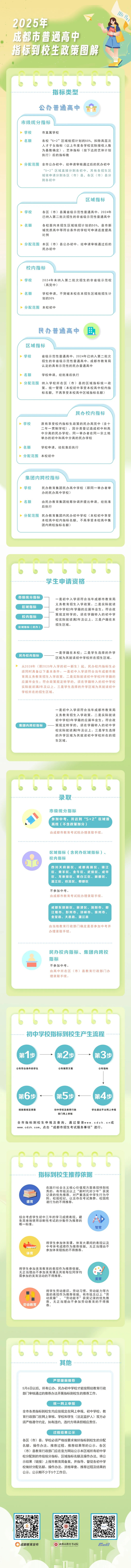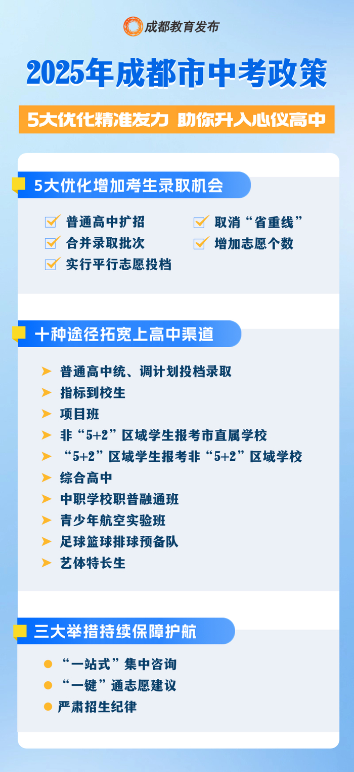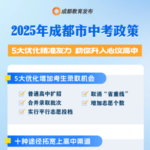 近日,成都市招考委、成都市教育局印发《2025年成都市高中阶段学校统一招生考试工作实施规定》。今年中招政策聚焦5大优化,进一步推进育人方式变革,促进普通高中多样化有特色发展,为广大学生提供更加多元化的选择,助力考生选填心仪学校,满足学生高中阶段多样化发展需求,助力学生全面而有个性的成长。