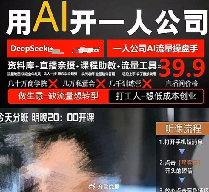 赵吉的情况并非个例。服装网店店主李李(化名)有给自己直播间引流的需求,看到一家专做“用DeepSeek教你月销售额提高三十万”的课程后,花了4000多元报名。宝妈肖女士想做自媒体博主,看到“AI教你账号涨粉”的课程后,花了2980元报名。但她们上课后都觉得有些后悔,“教的都是最皮毛的东西,只是被包装得很高大上”。