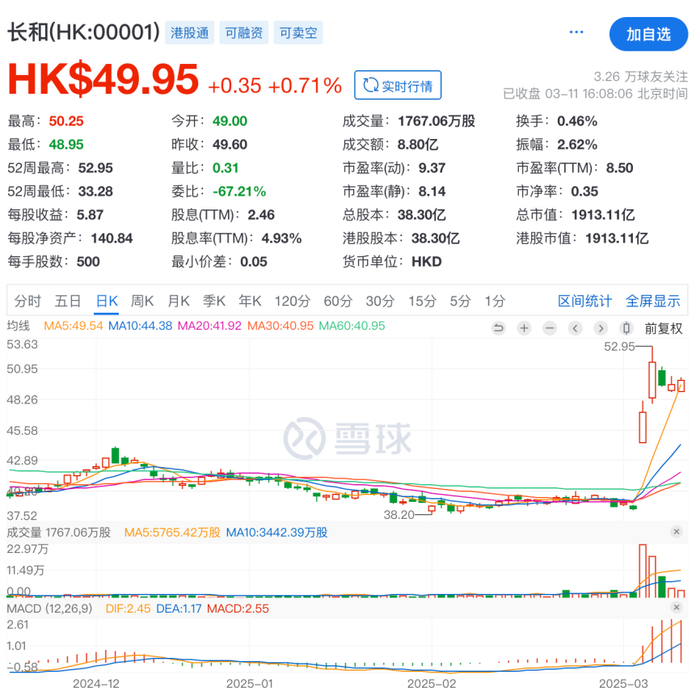 过去长和股价中隐含了地缘政治风险,此次交易让风险一次性出清。长和公布交易后,其股价从38块一路飙升到50块附近,带领本就火热的港股进一步上行。