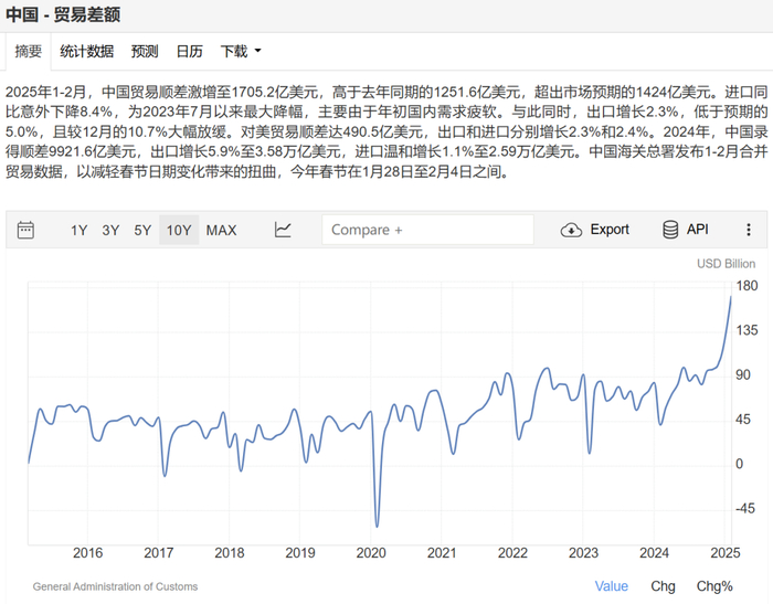 即便中国出口长期超预期,2025年开局显示,仍保持相当的韧性。考虑到前两个月进口下滑了7.3%,中国贸易顺差大幅超市场预期。