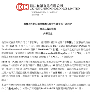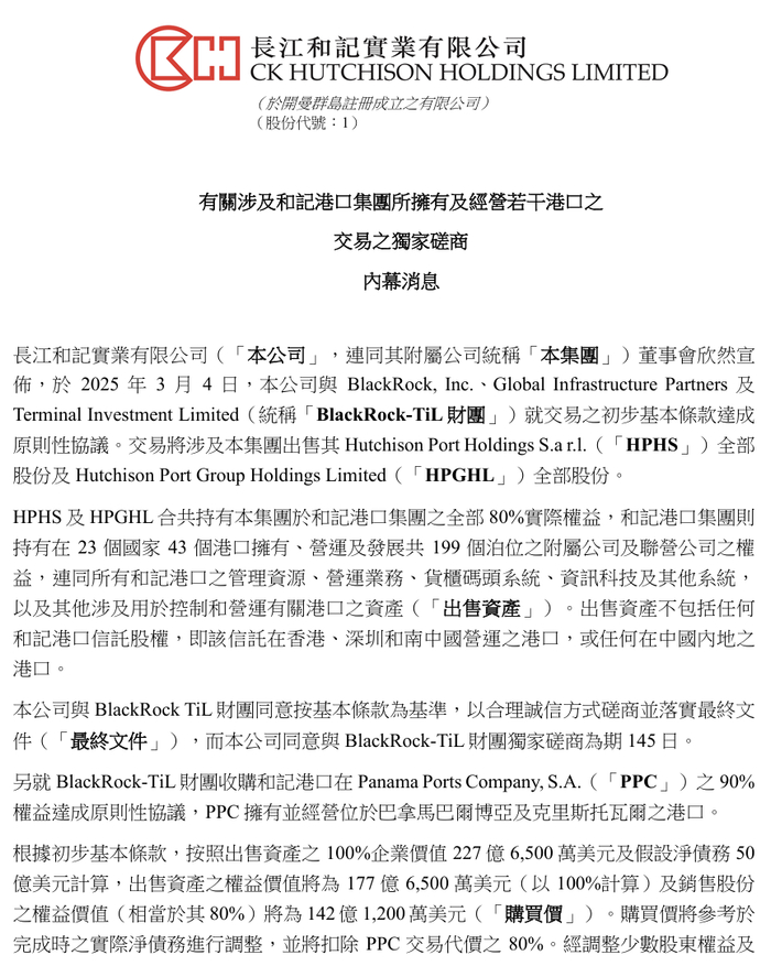原因是,旗下长江和记宣布,将把旗下港口业务的80%出售给由美国贝莱德集团和MSC旗下的码头投资有限公司Terminal Investment Limited,所组成的贝莱德-TiL财团。