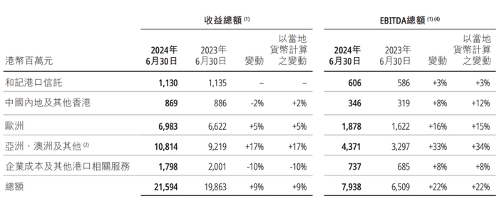 长和2024年半年报显示,港口业务收入整体增长了9%,息税前利润增长了33%。其中,业绩贡献最主要的地区是亚洲、欧洲及拉丁美洲地区,中国地区相对弱一些。备注部分明确,亚洲、澳大利亚及其他中,包括巴拿马、墨西哥及中东。