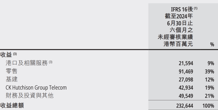 根据长和2024年半年报,其四大核心业务中,港口业务收入占比为9%,但息税前利润占比却高达21%,是赚钱效率最高的部门。