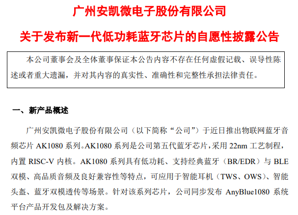 比如,安凯微3月4日晚间公告,公司近日推出物联网蓝牙音频芯片AK1080系列,该系列为第五代蓝牙芯片,采用22nm工艺制程,内置32-bit RISC-V内核。该产品具有低功耗、支持经典蓝牙与BLE双模、高品质音频及良好兼容性等特点,可应用于智能耳机、智能头盔、蓝牙双模透传等场景。