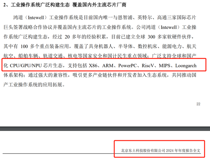 RISC-V的产业生态正在加速形成。东土科技日前在2024年年报中披露,公司鸿道(Intewell)工业操作系统广泛支持全球和国产化CPU/GPU/NPU芯片生态,支持X86、ARM、PowerPC、RISC-V、MIPS、Loongarch体系架构。