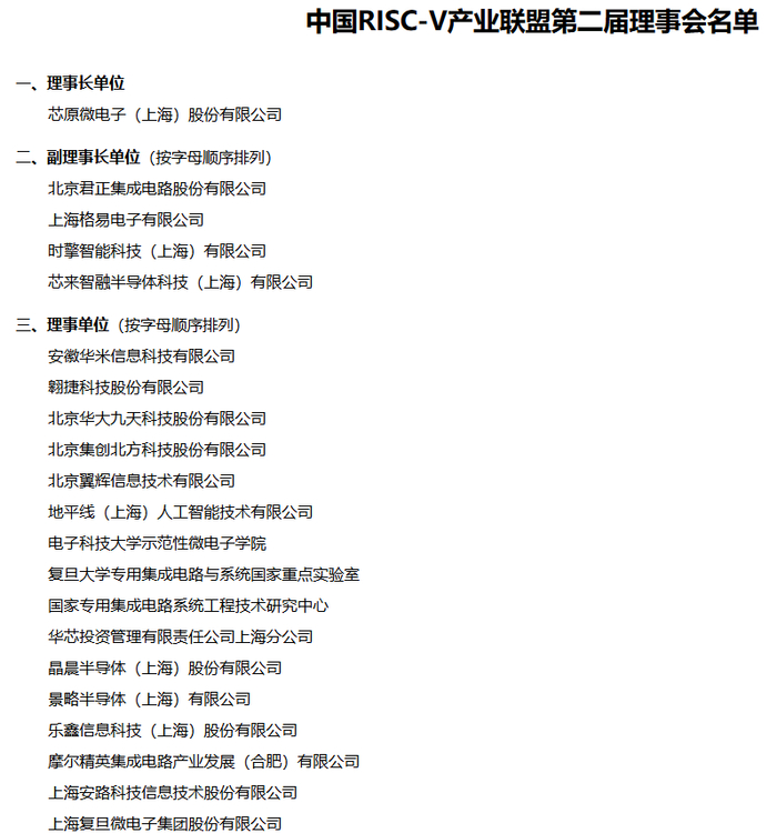2018年9月,中国RISC-V产业联盟(CRVIC)正式成立,第二届理事会名单显示,芯原股份是理事长单位,北京君正等是副理事长单位,翱捷科技、华大九天、地平线、晶晨股份、乐鑫科技、安路科技、复旦微电、中科蓝讯、云天励飞、国芯科技等多家上市公司为理事单位。2018年11月,中国开放指令生态(RISC-V)联盟(CRVA)成立,成员包括北京大学、腾讯、全志科技等高校、互联网公司和芯片公司。