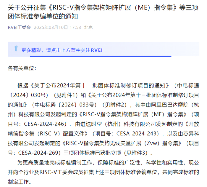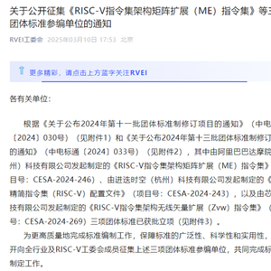 3月10日,RISC-V工委会公告,由阿里巴巴达摩院(杭州)科技有限公司发起制定的《RISC-V指令集架构矩阵扩展(ME)指令集》、由进迭时空(杭州)科技有限公司发起制定的《开放精简指令集(RISC-V)配置文件》,以及由芯昇科技有限公司发起制定的《RISC-V指令集架构无线矢量扩展(Zvw)指令集》三项团体标准已获批立项。为更高质量地完成标准编制工作,保障标准的广泛性、科学性和实用性,现公开向全行业及RISC-V工委会成员征集上述三项团体标准参编单位,共同完成标准的制定工作。