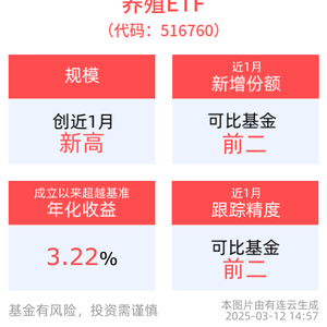 拉长时间看,截至2025年3月11日,养殖ETF近1周累计上涨2.03%。
