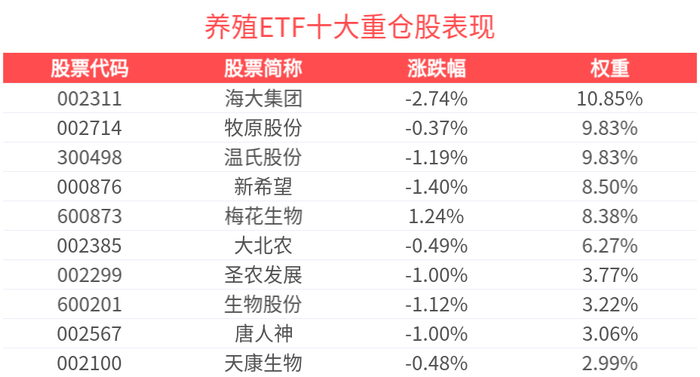 数据显示,截至2025年2月28日,中证畜牧养殖指数(930707)前十大权重股分别为海大集团(002311)、温氏股份(300498)、牧原股份(002714)、新希望(000876)、梅花生物(600873)、大北农(002385)、圣农发展(002299)、生物股份(600201)、唐人神(002567)、天康生物(002100),前十大权重股合计占比69.16%。