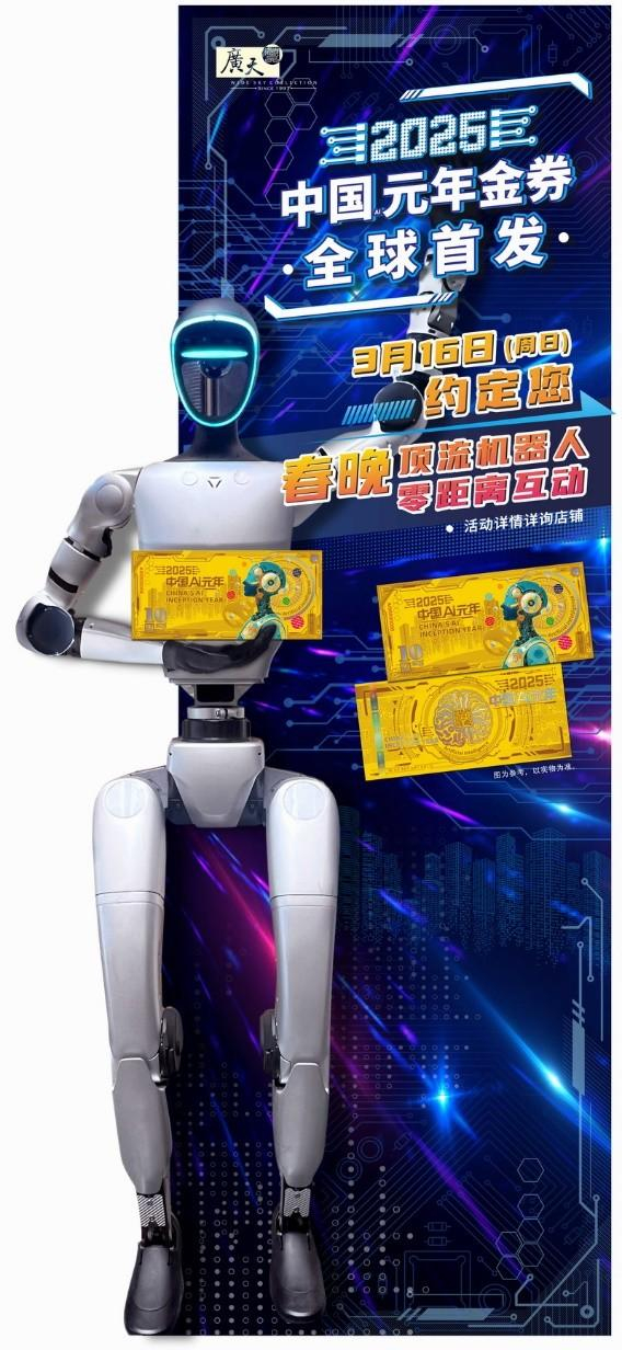 一场融合科技革命与黄金艺术的盛典 ——《中国AI元年》金券全球首发式将于3月16日在广州北京路广天藏品概念店拉开帷幕。这场活动不仅汇聚了“中国首枚AI纪念金券”单枚及四连体的首发盛况,还邀请了春晚顶流宇树机器人现场互动,更有颠覆性的首发优惠价燃点大家的收藏热情。