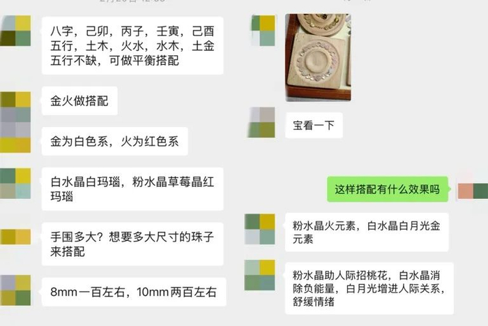 北京商报记者以消费者身份询问一水晶商家后,该商家根据所提供的出生日期搭配出一条粉水晶和白水晶相间的手串,并表示可以助人际关系、招桃花、舒缓情绪。