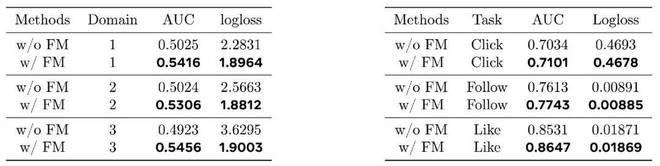 表 4(左)及 表 5(右):公开数据集上 FM 对跨域以及跨任务的 VM 的性能提升