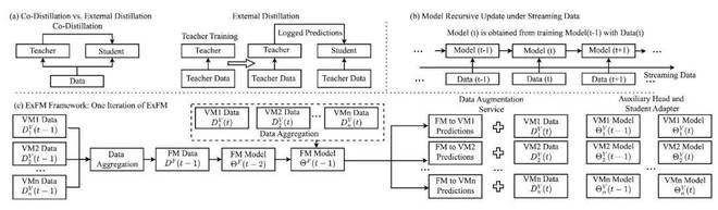 图 2:(a)联合蒸馏(Co-Distillation)与外部蒸馏(External Distillation);(b)流式数据下的模型迭代更新示意图;(c)ExFM 框架,以一次模型迭代为例的示意图。