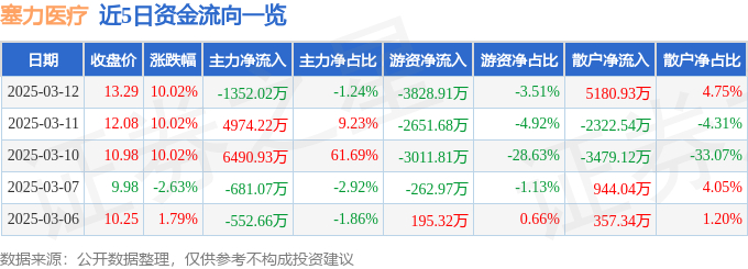 证券之星消息,塞力医疗3月12日涨停收盘,收盘价13.29元。该股于10点4分涨停,2次打开涨停,截止收盘封单资金为2369.81万元,占其流通市值0.93%。