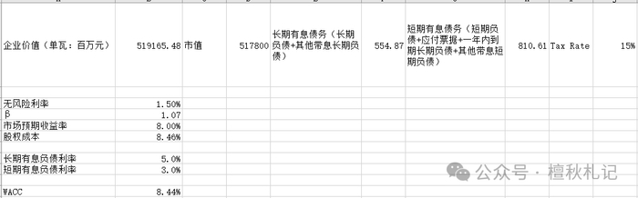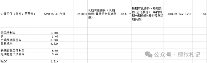 我们用五粮液做案例,来算一算WACC,首先计算camp即股权成本,我用十年期国债收益率1.5%,按照wind数据,A股β值1.06,假设市场预期收益率约等于过去股票市场平均收益率,约等于国内大部分资产内部回报率,约等于信托平均收益率,取一个均值大概6%。按照五粮液24Q3财报计算,WACC为6.31%,那DCF模型下,折现率因子取6.31%。