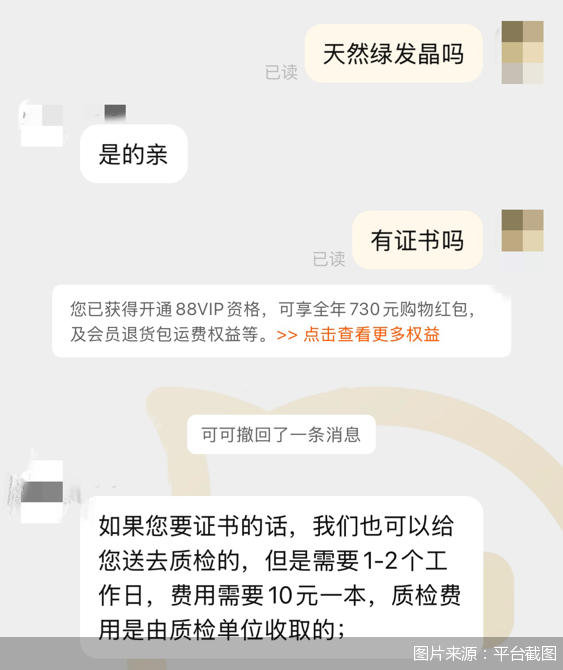 北京商报记者找到该家店铺的商品链接,发现其详情介绍中和客服表述中均承诺是绿发晶,但当询问是否有绿发晶的鉴定证书时,该店客服表示需要先支付10元工本费和质检费。