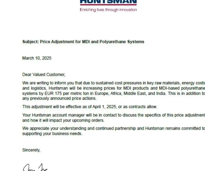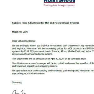 慧正资讯,2025年初,全球MDI(二苯基甲烷二异氰酸酯)市场掀起波澜。亨斯迈(Huntsman)在短短两个月内发起第二轮提价,继2月1日对欧洲、非洲、中东和印度MDI及聚氨酯产品提价125欧元/吨后,3月10日宣布自4月1日起再涨175欧元/吨。与此同时,万华化学欧洲公司宝思德、陶氏化学(Dow)、巴斯夫(BASF)等巨头也在第一季度密集上调MDI价格,涨幅在100-300美元/吨不等。与此同时,美国对中国MDI进口发起反倾销调查,进一步搅动市场风云。这一连串动作背后,既有厂商因低价高成本被迫提价的无奈,也有对市场需求变化与全球竞争格局的深刻应对。