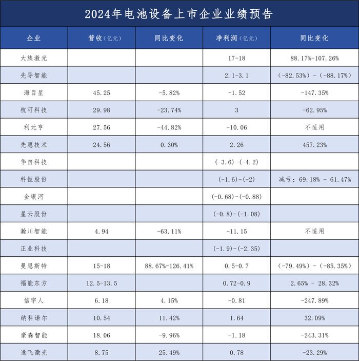 【冠业新材料·关注】大族/先导/海目星/金银河等18家电池设备上市企业发布2024年业绩预告(快报)