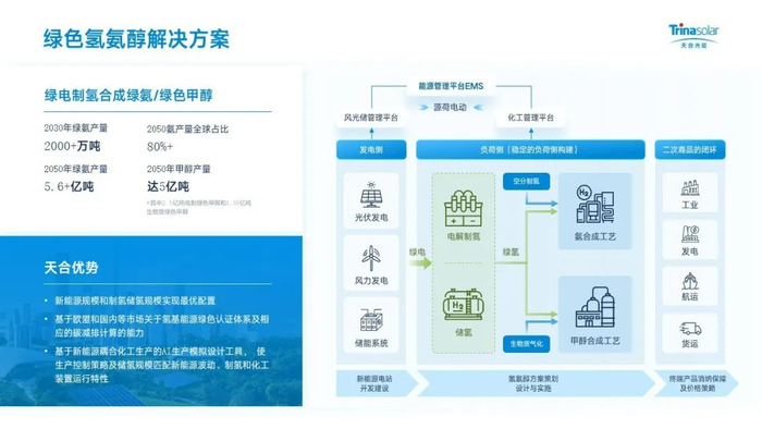 作为智慧能源解决方案领域的先行者,天合光能已率先从光伏产品制造商向光储智慧能源解决方案提供商转型。秉持 “以客户为中心,以场景为导向” 的理念,通过深度挖掘分布式能源、集中式电站及新场景需求,构建覆盖光储及场景融合、智能微网、虚拟电厂、零碳园区、绿色算力、绿电制氢氨醇等多元场景的解决方案矩阵。其中,绿电制氢耦合绿碳合成甲醇的应用场景,正成为破解能源化工领域脱碳难题的关键突破口。