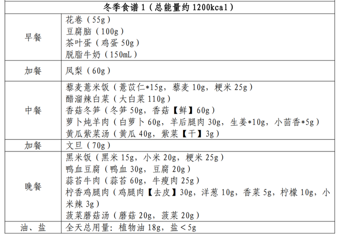 冬季则可选择玉米面窝窝头、清蒸鲈鱼、炒菠菜等。