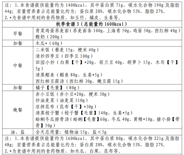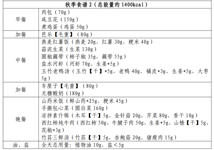 秋季推荐燕麦粥、清炖鸡胸肉、清炒时蔬等;