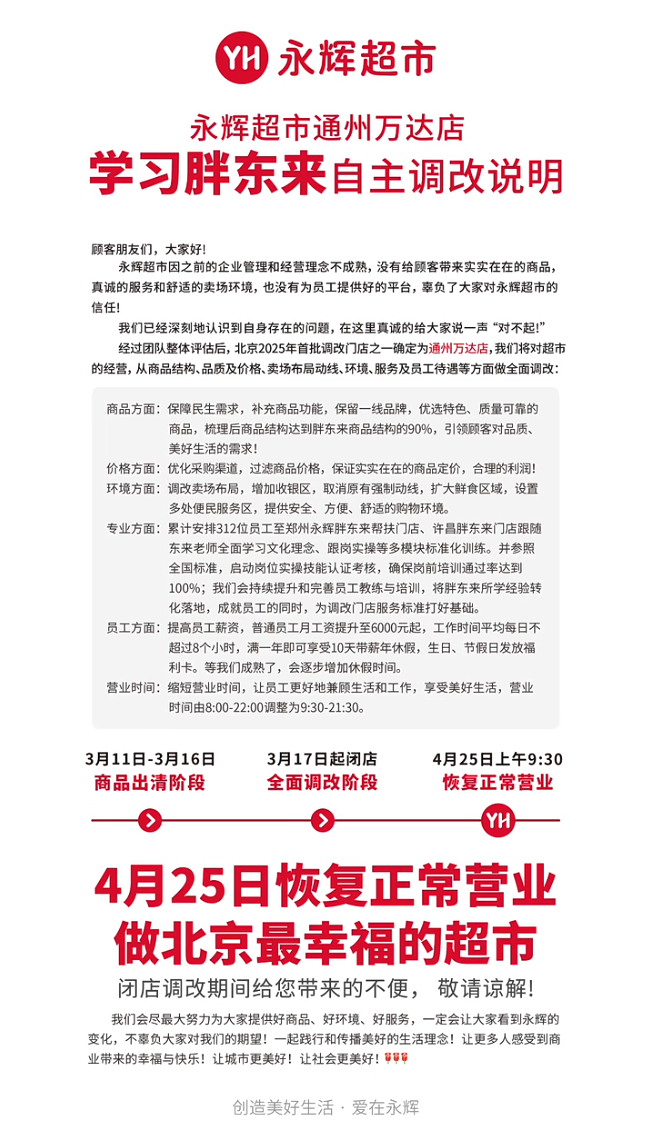 【导读】永辉超市通州万达店将学习胖东来自主调改