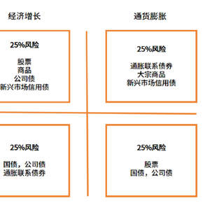 具体来看,全天侯策略将经济状态大致划分为四个象限并平均分配了25%的风险权重。同时,该策略还将资产类别与其相适应并发挥相对优势的经济状态一一对应。