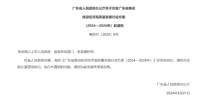 2024年5月21日,广东省人民政府办公厅印发《广东省推动低空经济高质量发展行动方案(2024—2026年)》。总体目标包括,到2026年,建立顺畅的管理机制、完备的基础设施、稳步增长的产业规模、显著提升的创新能力和不断拓展的应用规模。