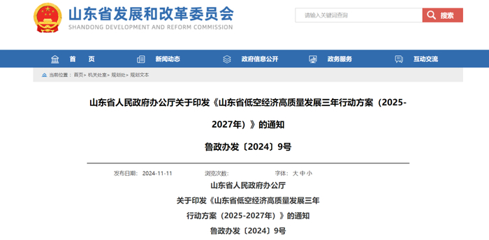 2024年11月2日,山东省人民政府办公厅公开发布《山东省低空经济高质量发展三年行动方案(2025-2027年)》,提出了总体要求、重点任务和保障措施,重点包括构建低空飞行服务网、技术创新赋能、应用场景拓展和产业能级跃升等方面。