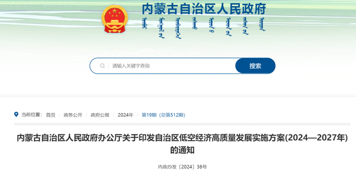 2024年9月12日,内蒙古自治区人民政府办公厅发布《内蒙古自治区低空经济高质量发展实施方案(2024—2027年)》,将发挥内蒙古区位优势、算力优势、空域优势,拓展丰富和示范推广“低空+”应用场景,带动低空飞行器及零部件制造、基础设施、低空飞行与保障一体化发展,培育新业态新模式,发展新质生产力。