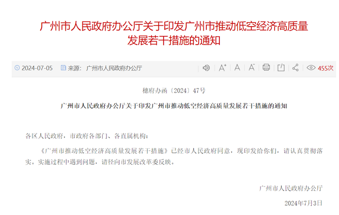2024年7月3日,广州市人民政府办公厅印发《广州市推动低空经济高质量发展若干措施》,共20条。就支持总部企业、整机和配套项目落地、申请适航审定、开辟航线、开展业务等方面列明量化指标,说明奖补金额或比例,并启动百亿金融授信,配合此前组建的低空经济百亿基金,加快培育壮大低空经济主体,推动完善低空基础设施、低空科技创新环境和低空多场景应用,促进低空经济及关联产业高质量发展。