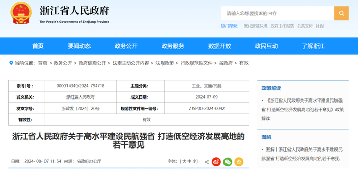 9、浙江省:《浙江省人民政府关于高水平建设民航强省 打造低空经济发展高地的若干意见》