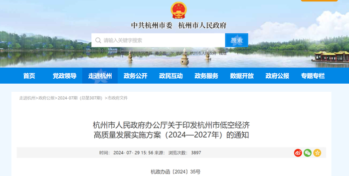 10、杭州市:《杭州市低空经济高质量发展实施方案(2024—2027年)》