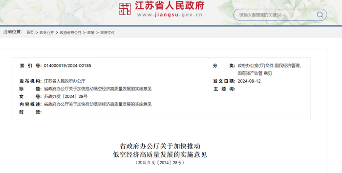 2024年8月12日,江苏省人民政府办公厅印发《关于加快推动低空经济高质量发展的实施意见》,明确了到2027年和2030年的发展目标,并提出了具体的重点任务和保障措施。到2027年,江苏省低空空域协同管理机制运转高效,低空经济发展规模全国领先。到2030年,智能互联、功能完善、安全高效的低空设施网基本建成,覆盖上中下游的特色产业链基本形成,低空飞行应用融入生产生活,低空经济成为全省战略性新兴产业新增长极,努力建成具有世界影响力的低空经济发展高地。