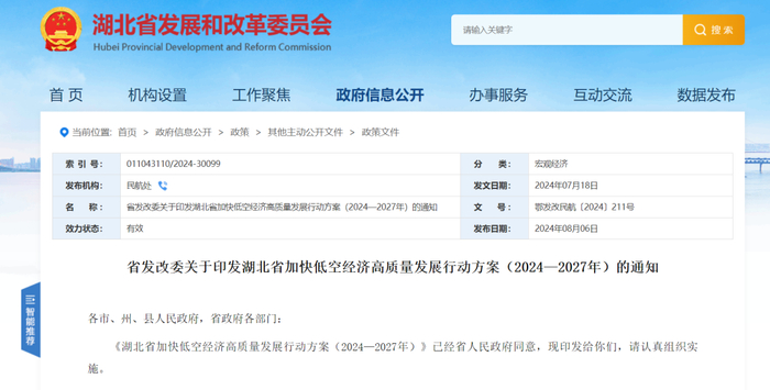 2024年7月18日,湖北省发展和改革委员会发布《湖北省加快低空经济高质量发展行动方案(2024—2027年)》,提出至2027年,湖北低空基础设施基本完备,产业能级大幅跃升,应用场景加快拓展,力争产业规模突破1000亿元。