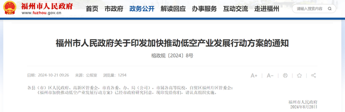 2024年8月28日,福州市人民政府印发《福州市加快推动低空产业发展行动方案》。《方案》提出,2025年底,布局无人机飞行服务站、临时起降点,打造低空产业创新平台,形成低空经济战略性新兴产业集群,争创民用无人驾驶航空器试验基地。2026年底,围绕打造高能级无人机产业体系,飞行服务更加优质,力争低空产业相关企业数量突破400家,组织筛选低空产业十大创新场景,争创国家低空经济示范区。