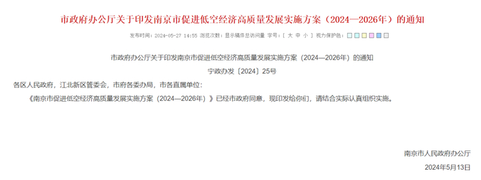 14、南京市:《南京市促进低空经济高质量发展实施方案(2024—2026年)》