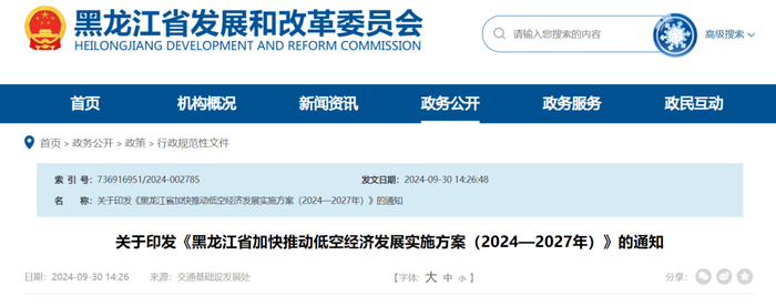 2024年8月1日,黑龙江省发展和改革委员会等六部门联合发布《黑龙江省加快推动低空经济发展实施方案(2024—2027年)》,明确2024至2027年发展目标、主要任务和保障措施。到2027年,黑龙江省低空经济产业规模力争达到800亿元以上,培育3—4家百亿级低空制造企业、10家以上十亿级低空制造企业,推动2—3个型号民用飞机适航取证。