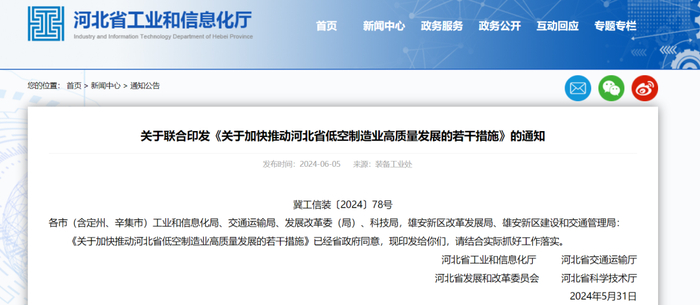 2024年5月31日,河北省工业和信息化厅等四部门联合印发《关于加快推动河北省低空制造业高质量发展的若干措施》,从5个方面15项具体措施。