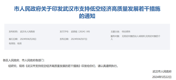 2024年6月7日,武汉市人民政府发布《武汉市支持低空经济高质量发展的若干措施》,主要包括支持低空经济重大项目的落户、低空基础设施的建设、标准规范的制定、试点航线的设立、企业科技创新能力的提升、金融支持、人才引进、企业技改投资以及产业集聚。