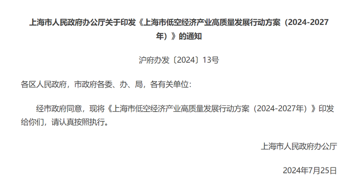 2024年7月25日,上海市人民政府印发《上海市低空经济产业高质量发展行动方案(2024-2027年)》。《行动方案》包括三部分,一是主要目标;二是提出6个方面23项重点任务;三是保障措施。