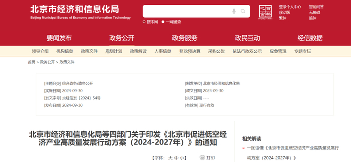 2024年9月30日,北京市经济和信息化局等四部门联合印发《北京市促进低空经济产业高质量发展行动方案(2024-2027年)》,主要包括加强技术创新、安全管控、全产业链竞争力、监管及服务支撑体系建设、基础设施优化和飞行应用创新示范六个方面的重点任务,力争通过三年时间,将北京市低空经济产业规模提升至1000亿元。