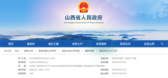 2024年5月17日,山西省人民政府办公厅公开发布《山西省加快低空经济发展和通航示范省建设的若干措施》,从5个方面提出了21项具体措施,包括拓展通航应用场景、加快基础设施建设、提高通航研发制造水平、激发通航消费市场活力和加大通航人才培育力度等。