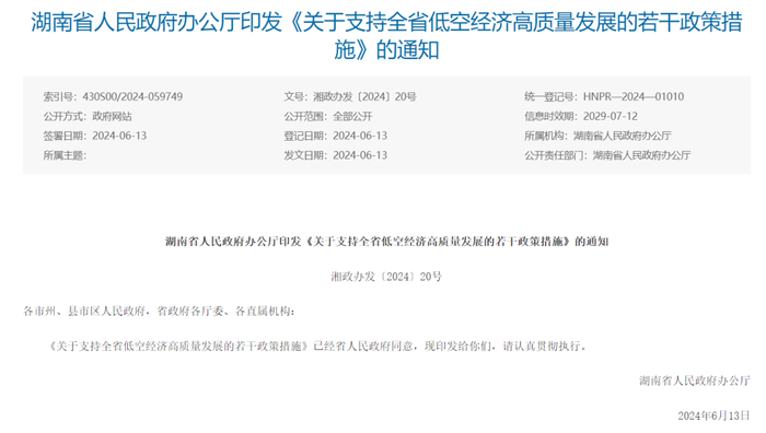 2024年6月13日,湖南省人民政府办公厅印发《关于支持全省低空经济高质量发展的若干政策措施》,着力从十二个方面发力,培育低空经济成为战略性新兴产业。