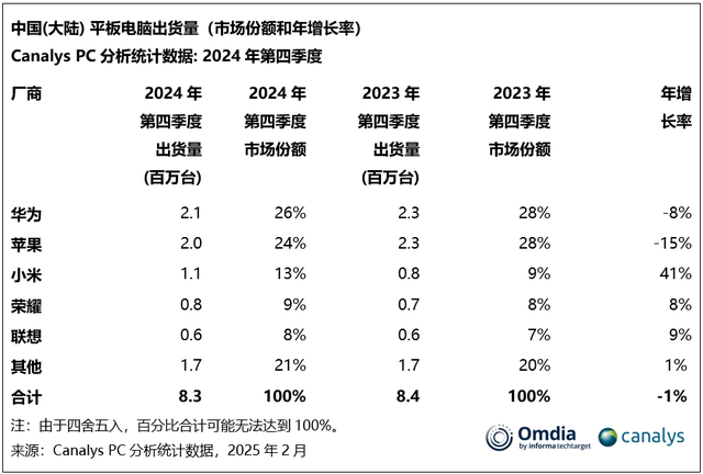 根据报告,中国大陆PC出货量尽管在去年底有所回升,但是受商用市场需求疲软拖累,2024年全年出货量仍下降了4%,降至3970万台。然而,平板电脑市场却大幅增长了11%,达到3150万台,预计2025年将保持增长势头。Canalys预测,得益于政府消费补贴和主要厂商新品发布,中国大陆的PC市场今年将增长3%,达到4100万台,平板电脑市场将增长1%,达到3190万台。