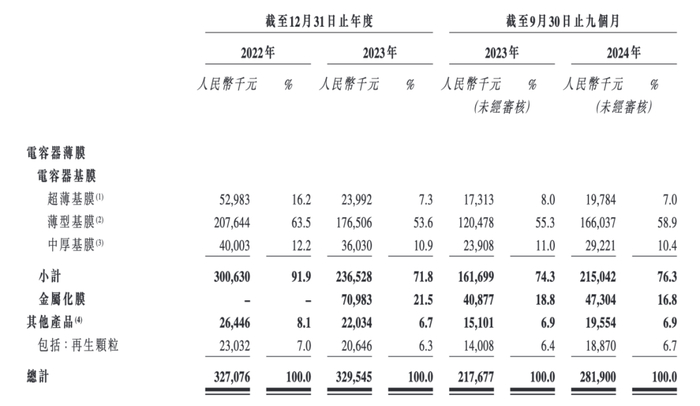 其中,电容器基膜是薄膜电容器的电介质,直接决定了薄膜电容器的性能,2022年、2023年及2024年前三季度(以下简称“报告期内”),电容器基膜的收入分别为3.01亿元、2.37亿元和2.15亿元,占其各期总收入的比例为91.9%、71.8%、76.3%。