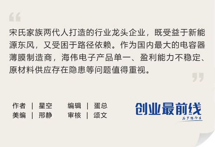 宋氏家族两代人打造的行业龙头企业,既受益于新能源东风,又受困于路径依赖。当资本市场的聚光灯亮起,海伟电子产品单一、盈利能力不稳定、原材料供应存在隐患等问题都被置于放大镜下审视。