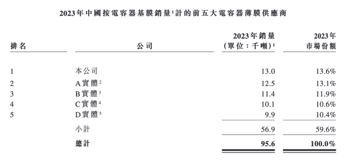 尽管海伟电子是电容器基膜行业的龙头企业,按2023年的销量来看,其电容器基膜销量为1.3万吨,市场占有率为13.6%。而行业第二名的销量为1.25万吨,市场占有率为13.1%。行业第三名的销量为1.14万吨,市占率为11.9%。