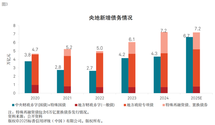新增政府债结构的变化呈现以下三个特征:中央政府负债上升较多、专项债支持领域和用途扩展、额度分配由防风险向促发展转变,体现出中央政府承担更多加杠杆责任,同时提升专项债资金使用效率,提升财政政策效果。在地方政府债务压力仍然较大背景下,2025年中央政府负债上升更多。若将地方政府发行的特殊新增专项债及置换债券考虑在内,2020至2024年末,新增国债占央地债务规模的比率分别约为45%、34%、35%、41%、37%,其中2020年和2023年占比较高,主要因为2020年新增抗疫特别国债1万亿元,2023年4季度增发1万亿元国债;根据政府工作报告和预算报告计划新增债务情况,2025年,加上超长期特别国债1.3万亿元和特别国债5000亿元,当年新增国债占比提升至48%,中央政府负债上升显著快于地方。