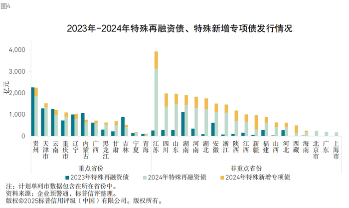 2025年政府工作报告再次释放了中央“坚持在发展中化债、在化债中发展”的信号,提出“动态调整债务高风险地区名单,支持打开新的投资空间”,体现了中央在防范化解地方政府债务风险的同时,注重平衡经济增长与风险防控的政策思路。近年来,用于置换存量债务的地方政府债分配向非重点地区倾斜。2024年政府用于置换存量债务的化债额度主要有两部分,特殊再融资债(含盘活结存限额和2万亿元置换债券)、特殊新增专项债。相较于2023年重点省份获得再融资债化解债务额度显著高于非重点省份的情况,2024年起,化债额度分配并没有对重点化债省份过度倾斜,非重点省份获得化债额度明显提升。其中,江苏、贵州、四川、山东、湖南、河南等地发行规模较大,体现了当前化债额度在分配上主要参考为各省隐性债务余额,同时注重地方经济发展。我们认为,经过几年的隐性债务化解,地方化债已经取得一定成果,尾部城投风险得到控制,未来债务资源分配重心从保化债向注重地方经济发展转变,经济较发达区域或将获得更多债务额度的支持。